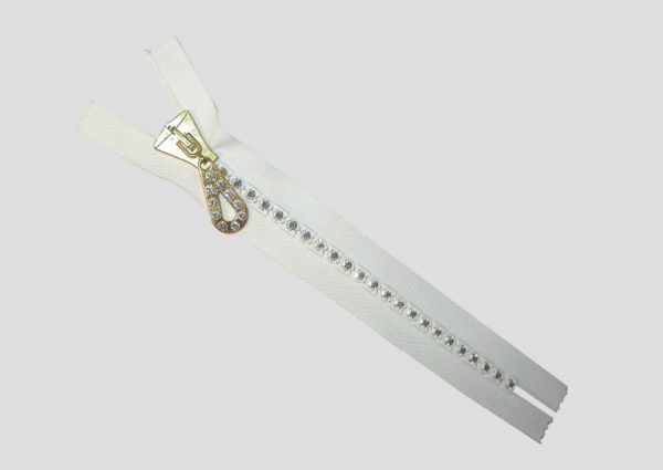 Zipper – 20cm – Closed Ended – Bell Tag – White. Crystal Colour. Metallic gold bell tag. Swarovski Crystal. Made in Austria.
